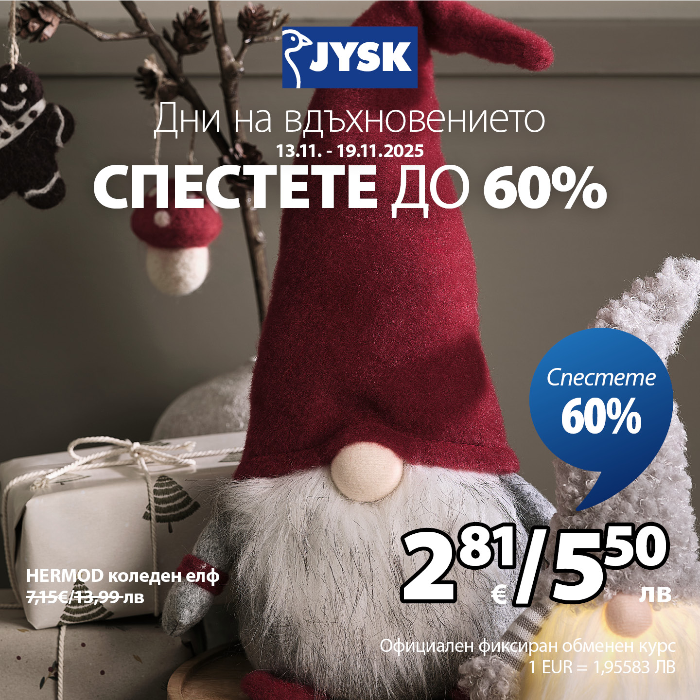 Спестете до 60% на избрани артикули като коледни елфи, завеси, кувертюри, коледни лампички, кошници и други. Пазарувайте онлайн на JYSK.bg или във физическите магазини на JYSK.