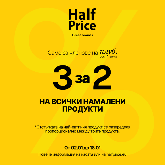 Промоцията е валидна само за членове на клуба CCC и HalfPrice и важи от 2 януари до 18 януари или до изчерпване на количествата. Все още не сте член на клуба? Присъединете се още днес и се възползвате от предимствата! Очакваме Ви в HalfPrice!