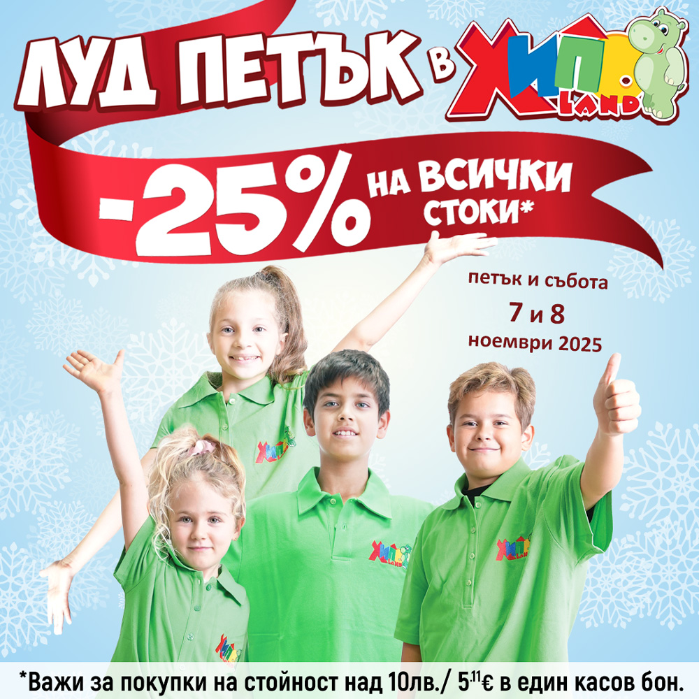 Луд петък в Хиполенд на 7 и 8 ноември 2025 г., петък и събота. Насладете се на 25% отстъпка на абсолютно всички стоки във всички магазини и при покупка на стойност над 10 лв. (€5.11) в един касов бон.