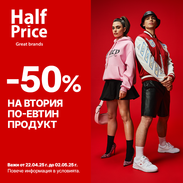 -50% на втория по-евтин продукт се завърна в HalfPrice. Офертата е валидна от 22 април до 2 май. Побързайте, преди някой друг да се възползва първи. Пълни условия на halfprice.eu HalfPrice. Great Brands.