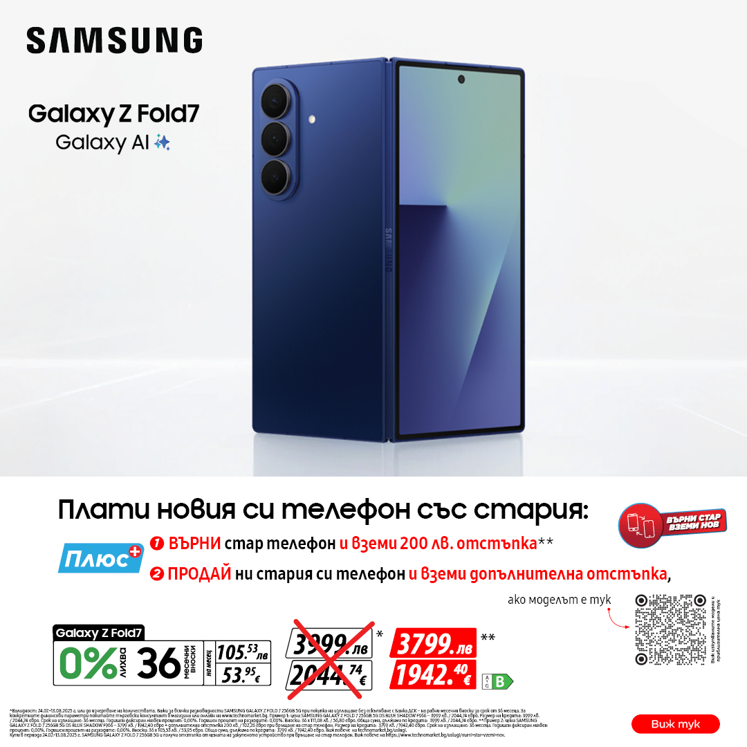 Galaxy Z Fold7 никога не е бил по-достъпен, а промяната никога не е била толкова сладка! Върни стария си телефон и вземи 200 лв. отстъпка за новия Galaxy Z Fold7! Ако моделът ти е част от услугата ни „Върни стар, вземи нов“, ще получиш и допълнителен ваучер на стойността на оценката за старото ти устройство! Всичко това – с опция за изплащане БЕЗ оскъпяване за 36 м. Възползвай се сега от Техномаркет!