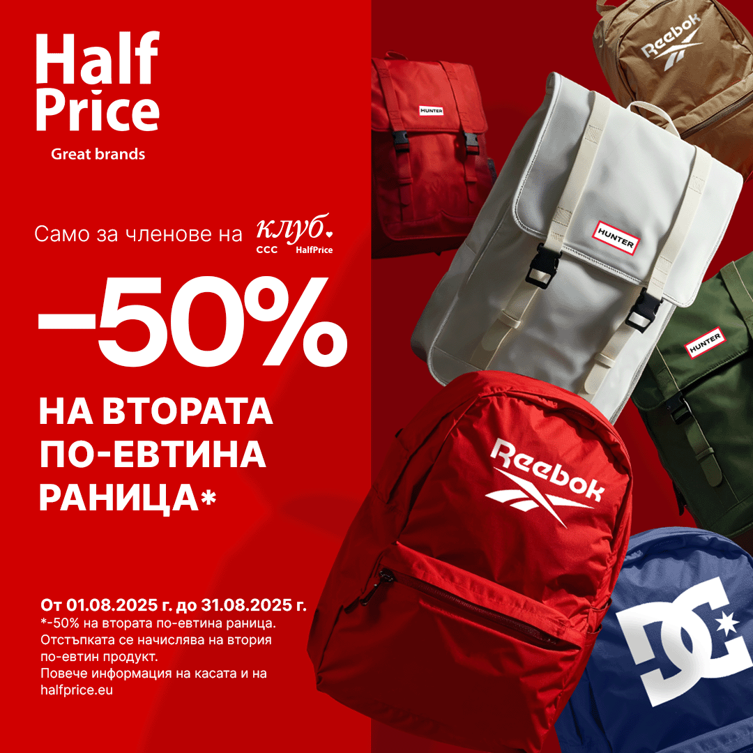 Нов сезон, нова раница, нова промоция в HalfPrice. Купете две раници и вземете втората по-евтина с -50%. Отстъпката се начислява на втория по-евтин продукт. Reebok? Crocs? Juicy Couture? Имаме всичко (и още много)!
