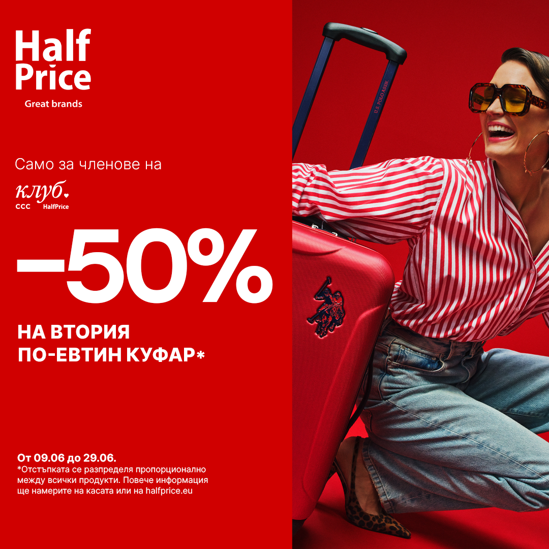 Планина или Малдиви? Няма значение - важното е, че вече сте готови за всяко пътуване! В HalfPrice, получавате 50% отстъпка от втория, по-евтин куфар - само за клубни членове на CCC и HalfPrice!