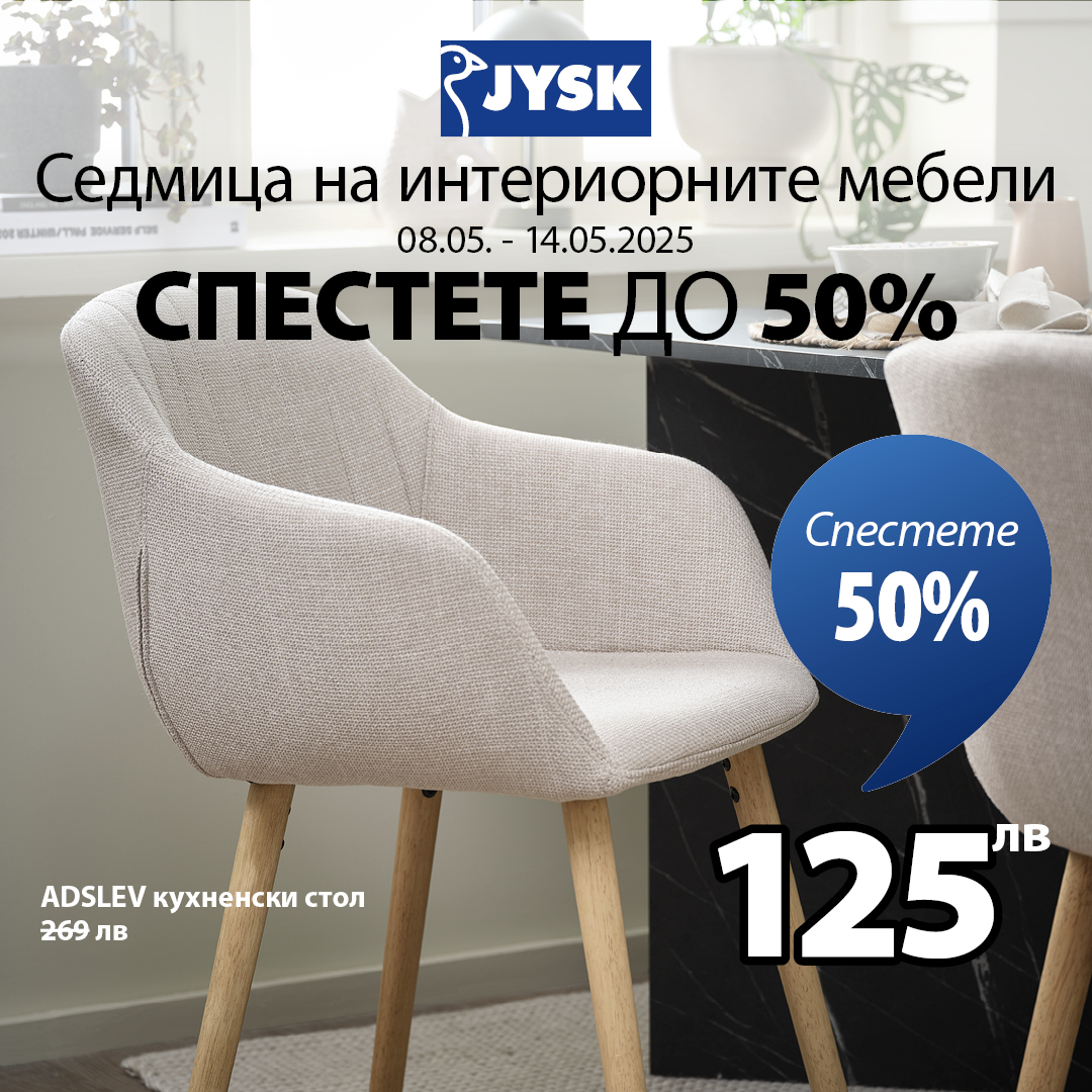 Седмица на интериорните мебели в JYSK! Спестете до 50% на избрани интериорни мебели като бюра, огледала, маси за кафе, кухненски маси и столове и много други. Промоцията важи за периода 08.05. – 14.05.2025 г.