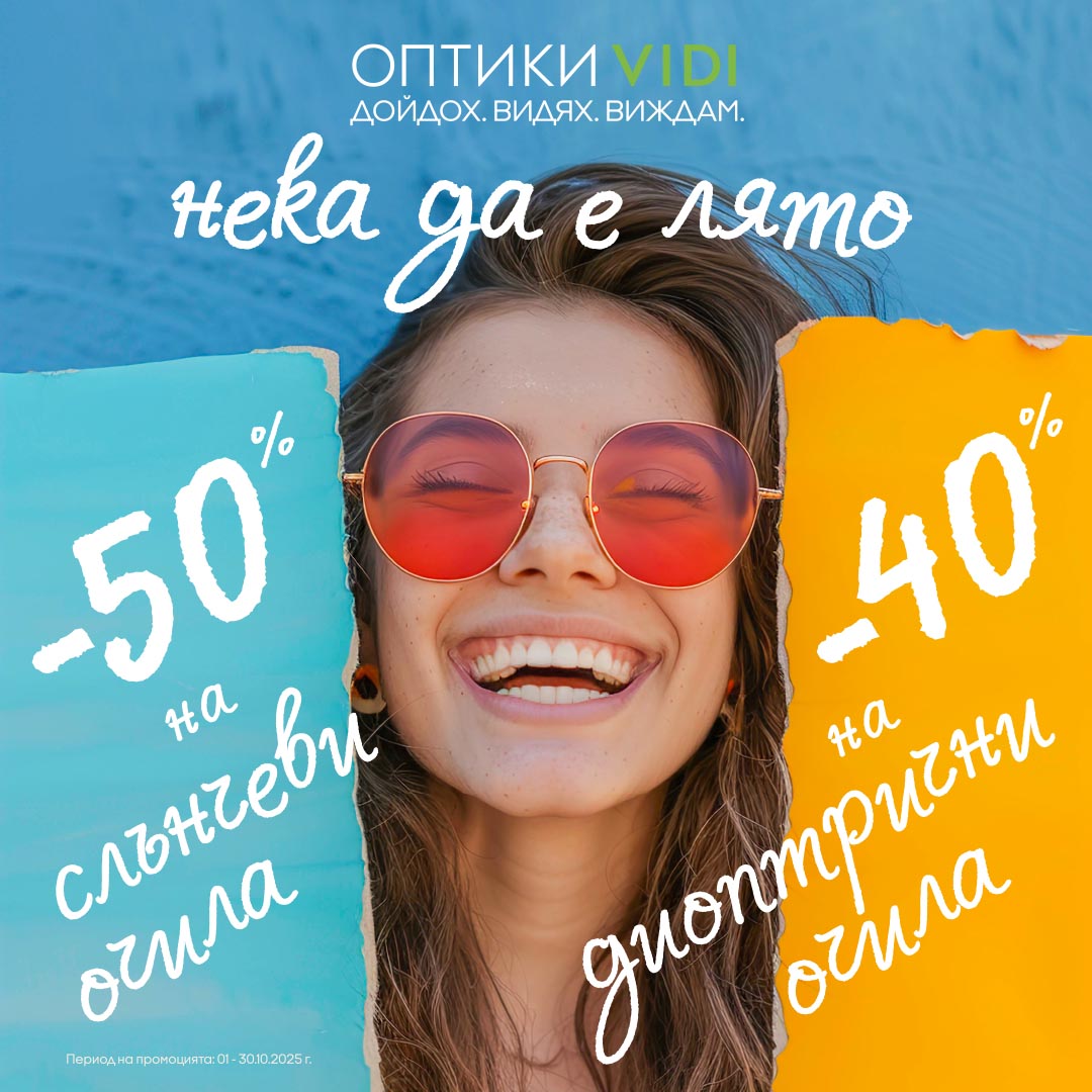 -50% на всички слънчеви очила и -40% на всички диоптрични очила (рамка+стъкла)