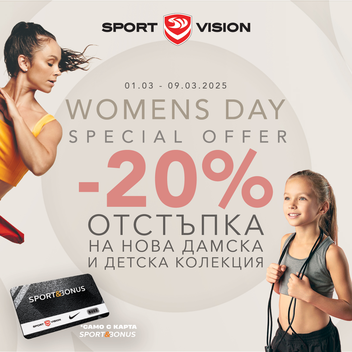 Промоцията важи за физическите магазини на Sport Vision с карта за лоялност Sport & Bonus. Не пропускайте възможността да обновите гардеробa за новия сезон на преференциални цени.